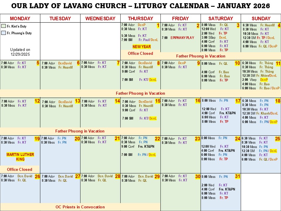 Please contact Our Lady of Lavang Office (714) 775-6200, or our administrator Toma Kiet Pham.